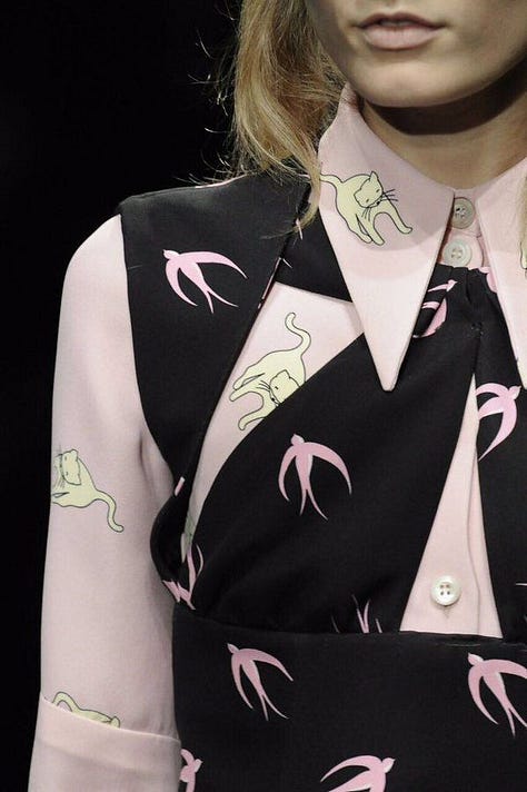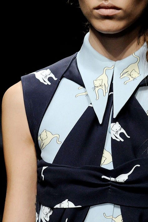 When I first saw Miu Miu’s Spring/Summer 2010 runway show, I was instantly smitten by the sickly-sweet cutesy prints, as did the rest of the fashion world. The pink swiftlets on black background and the white cats on blue background are my favourites of the lot!