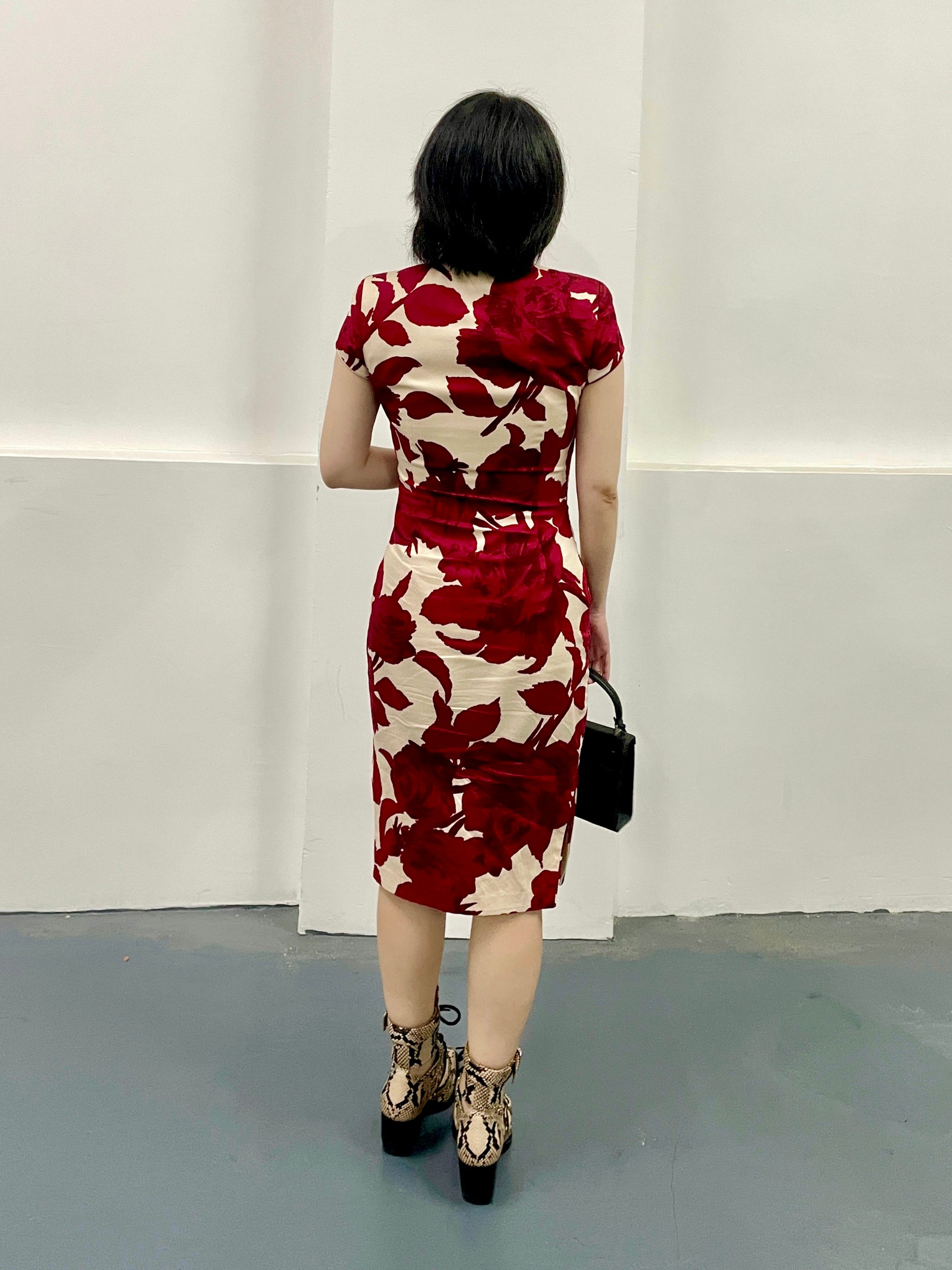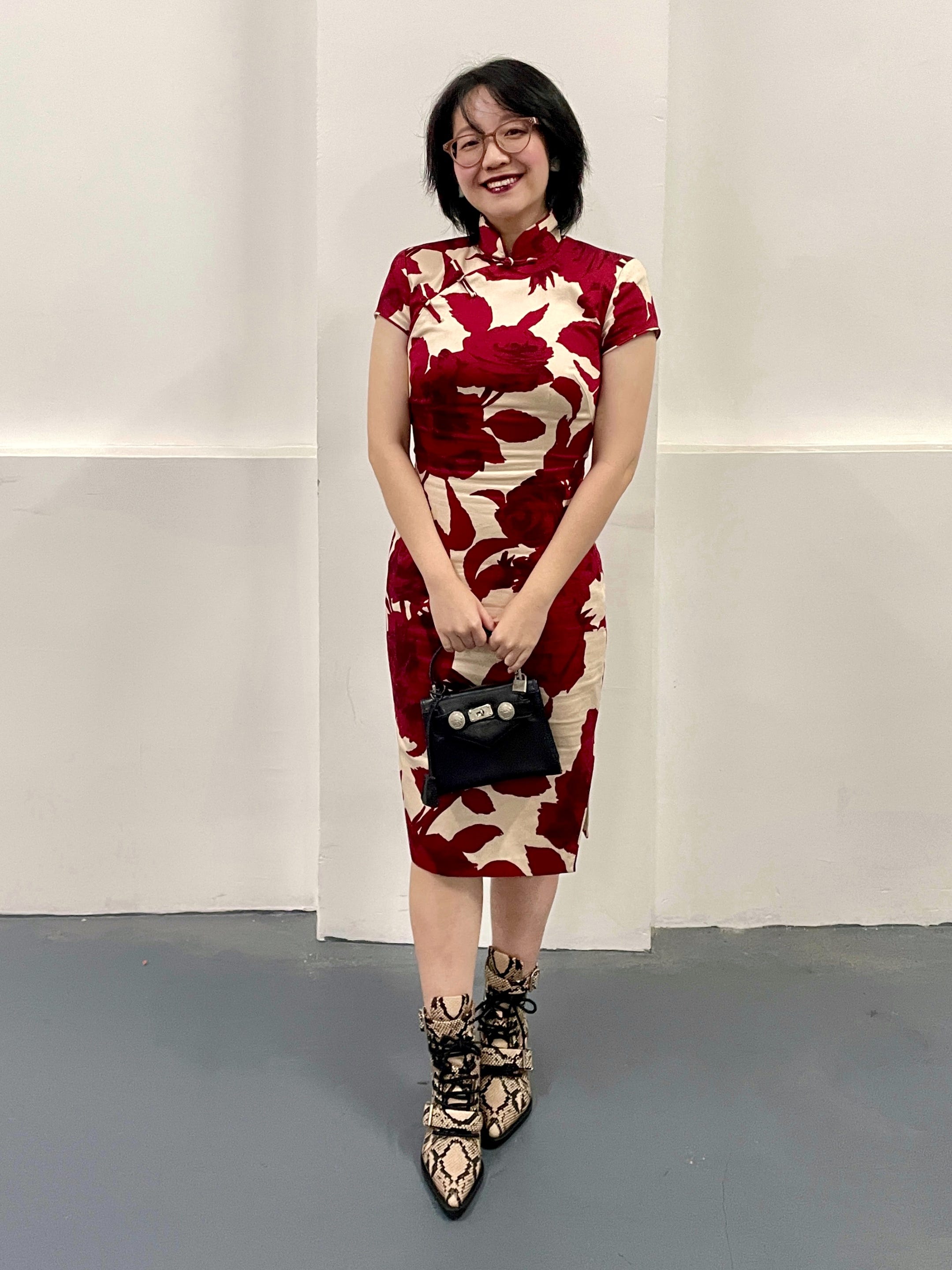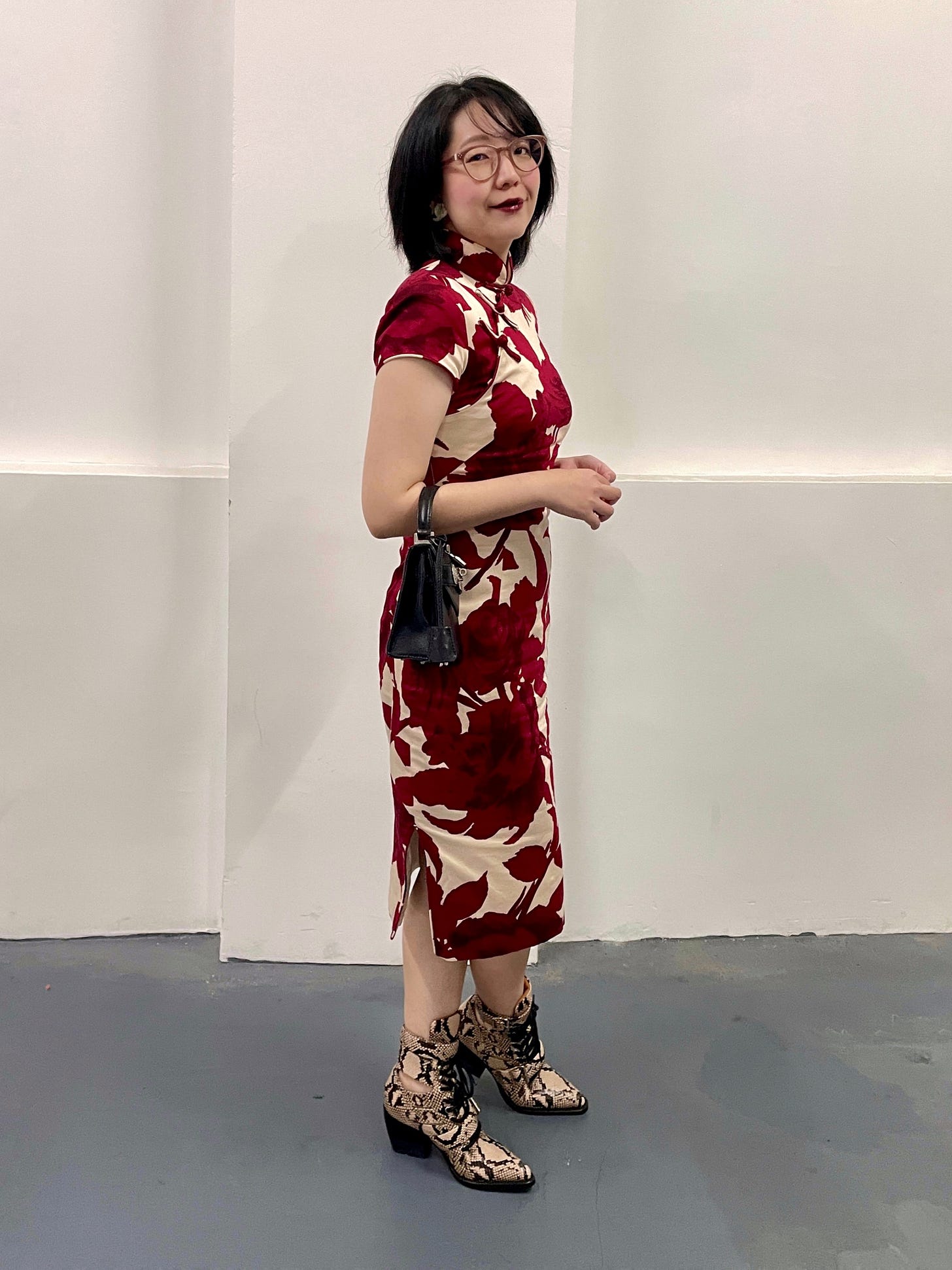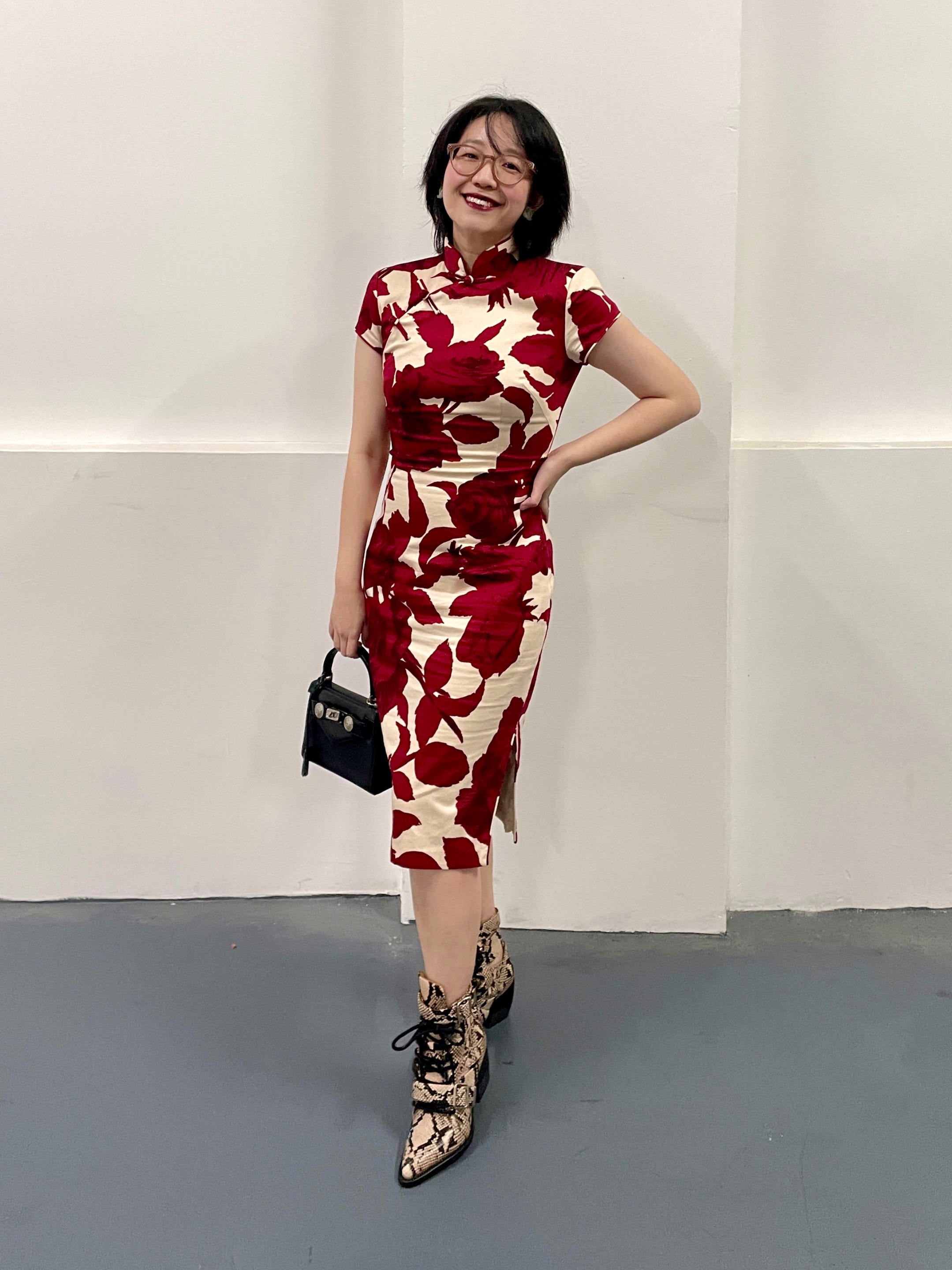 Although floral prints are often the motif of choice for New Year-worthy qipaos, I think the pale pink background with large burgundy roses is quite ingenious, as opposed to the usual daintier florals in bright red. Another detail I love is the pankou knots made from the same fabric, so they kind of blend into the dress a bit. As always with Shanghai Tang qipaos, they hug all my curves in all the right places; I barely had enough room to breathe once I was stuffed with meals, though.